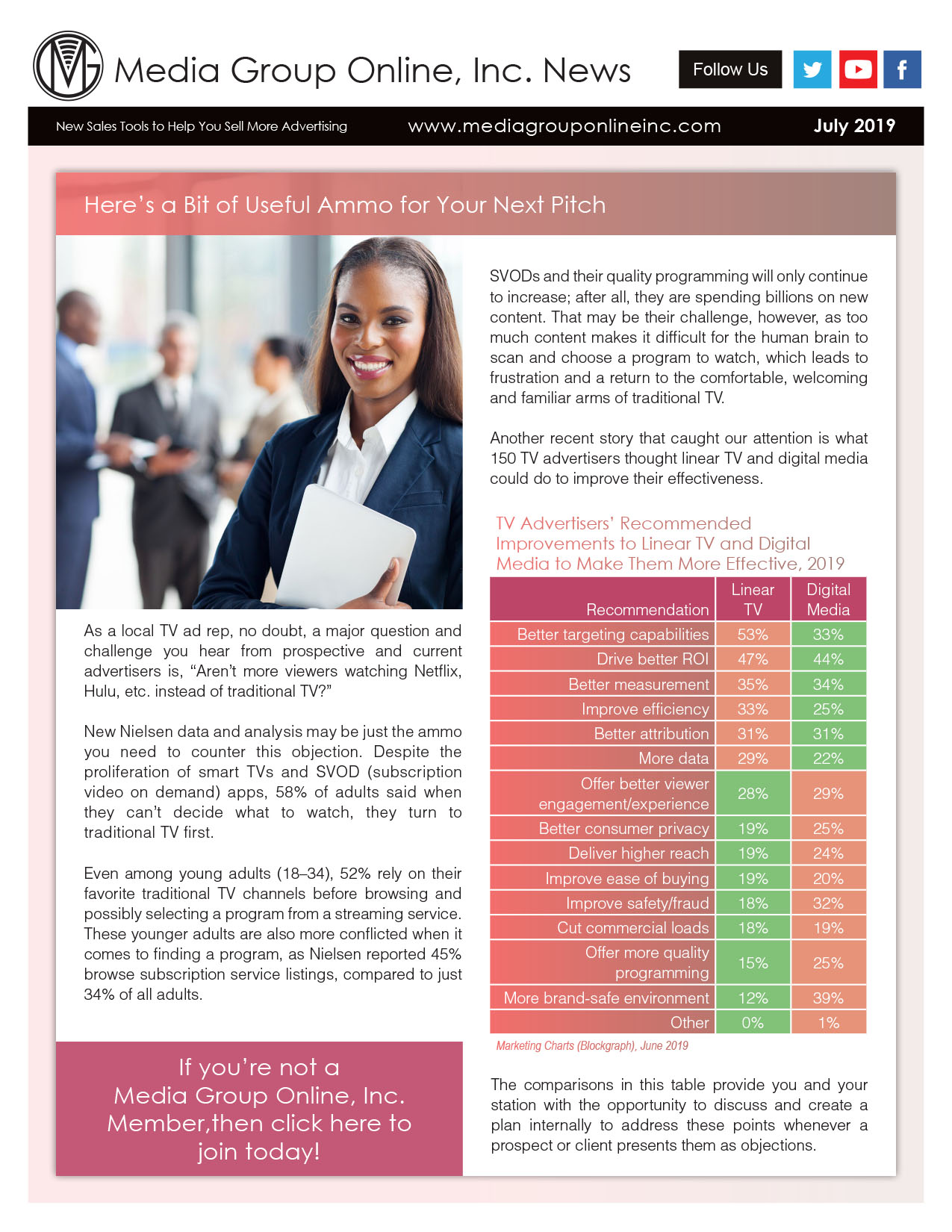 New Nielsen data and analysis may be just the ammo you need to counter this objection. Despite the proliferation of smart TVs and SVOD (subscription video on demand) apps, 58% of adults said when they can’t decide what to watch, they turn to traditional TV first.