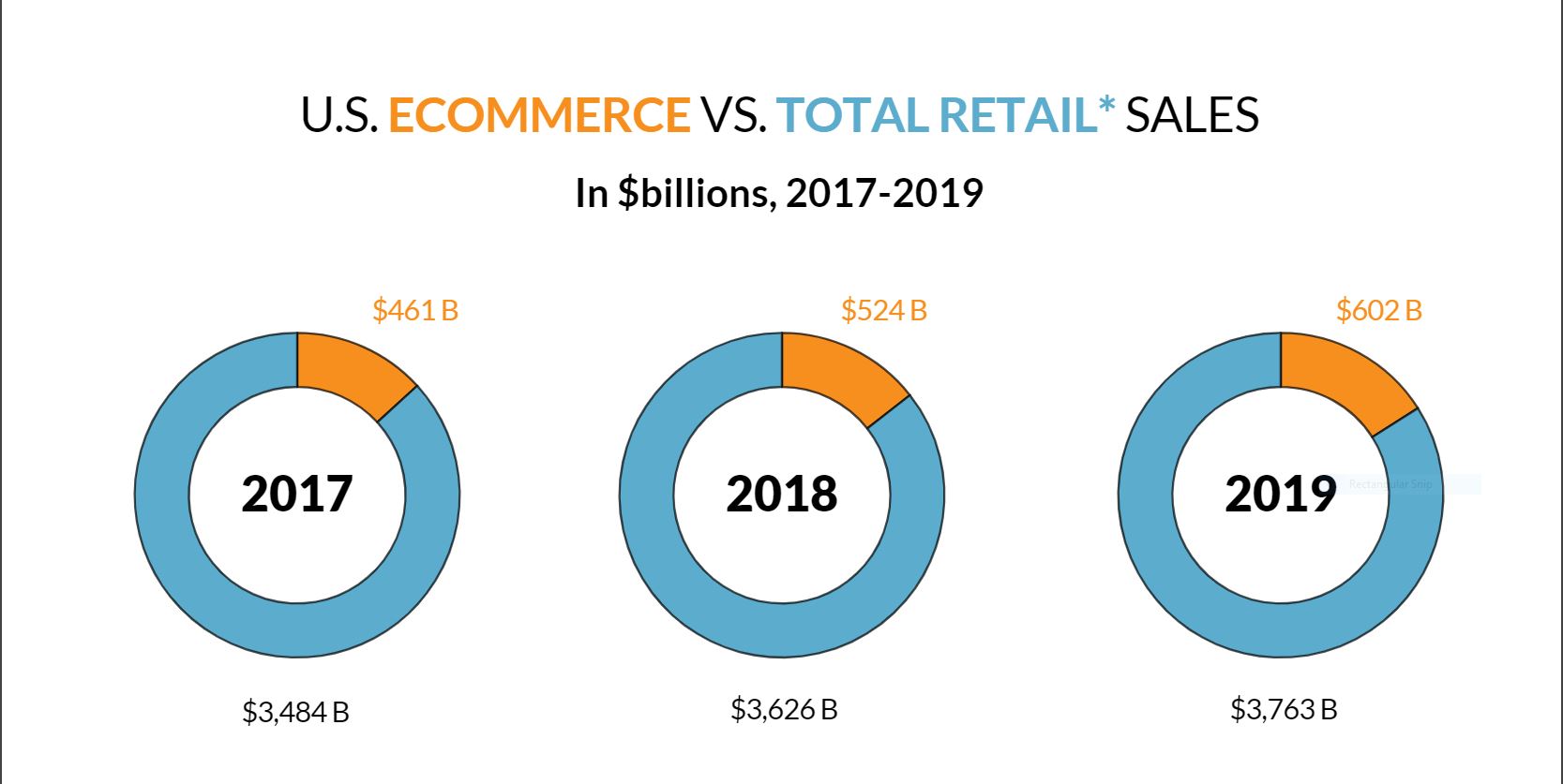 Total retail sales increased 3.8% in 2019 to $3.763 trillion from $3.626 trillion the year before, according to Digital Commerce estimates using Commerce Department figures. The performance of overall retail last year marked a slight slowdown from 2018, when sales through all channels jumped 4.1%. Digital Commerce 360 studies non-seasonally adjusted Commerce Department data and excludes sales of items not normally purchased online such as spending at restaurants, bars, automobile dealers, gas stations and fuel dealers.